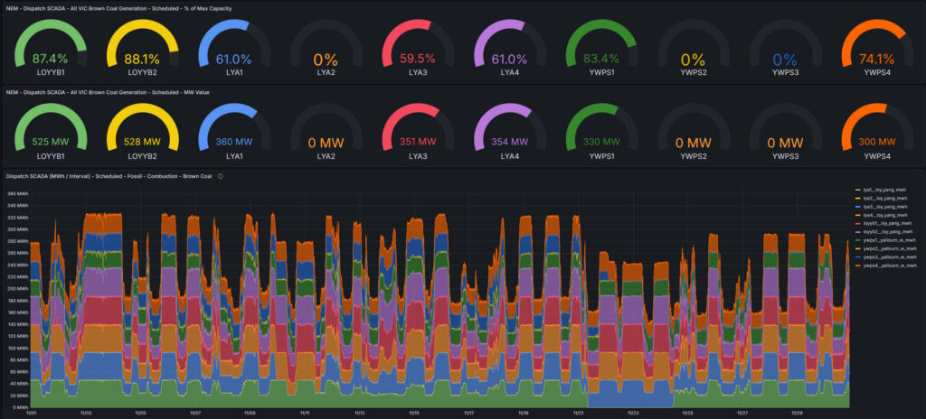 • Grafana queries filter by region (VIC1) and fuel descriptor (Brown Coal), aggregating per-unit output.