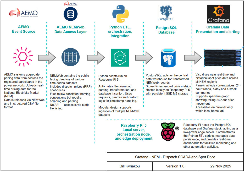 Data flow: NEMWeb → Python ETL → PostgreSQL → Grafana