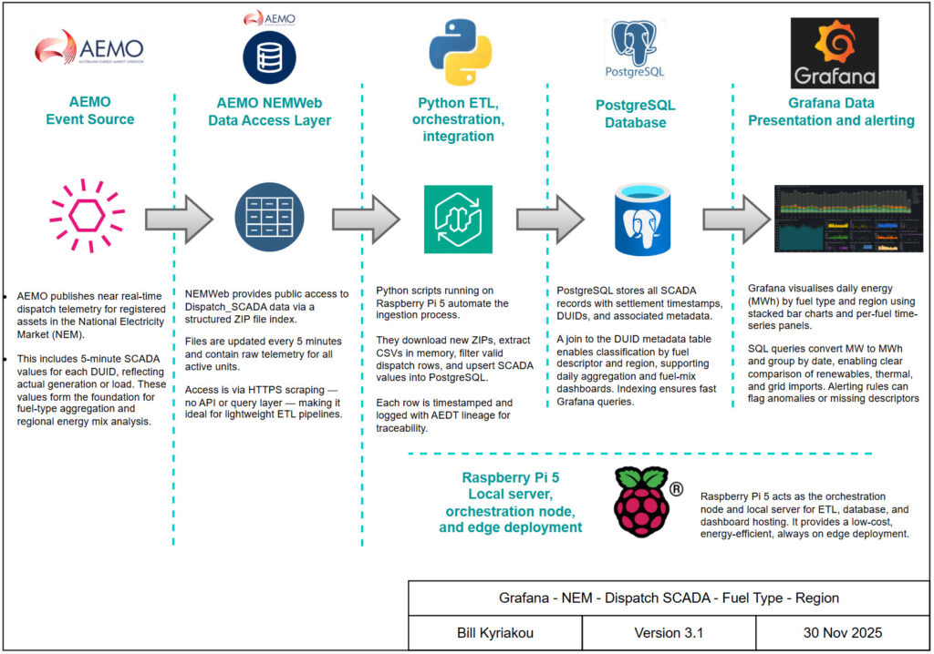 - Database: PostgreSQL stores settlement timestamps, DUIDs, SCADA values (MW), last changed, filename, and fetched_at lineage.