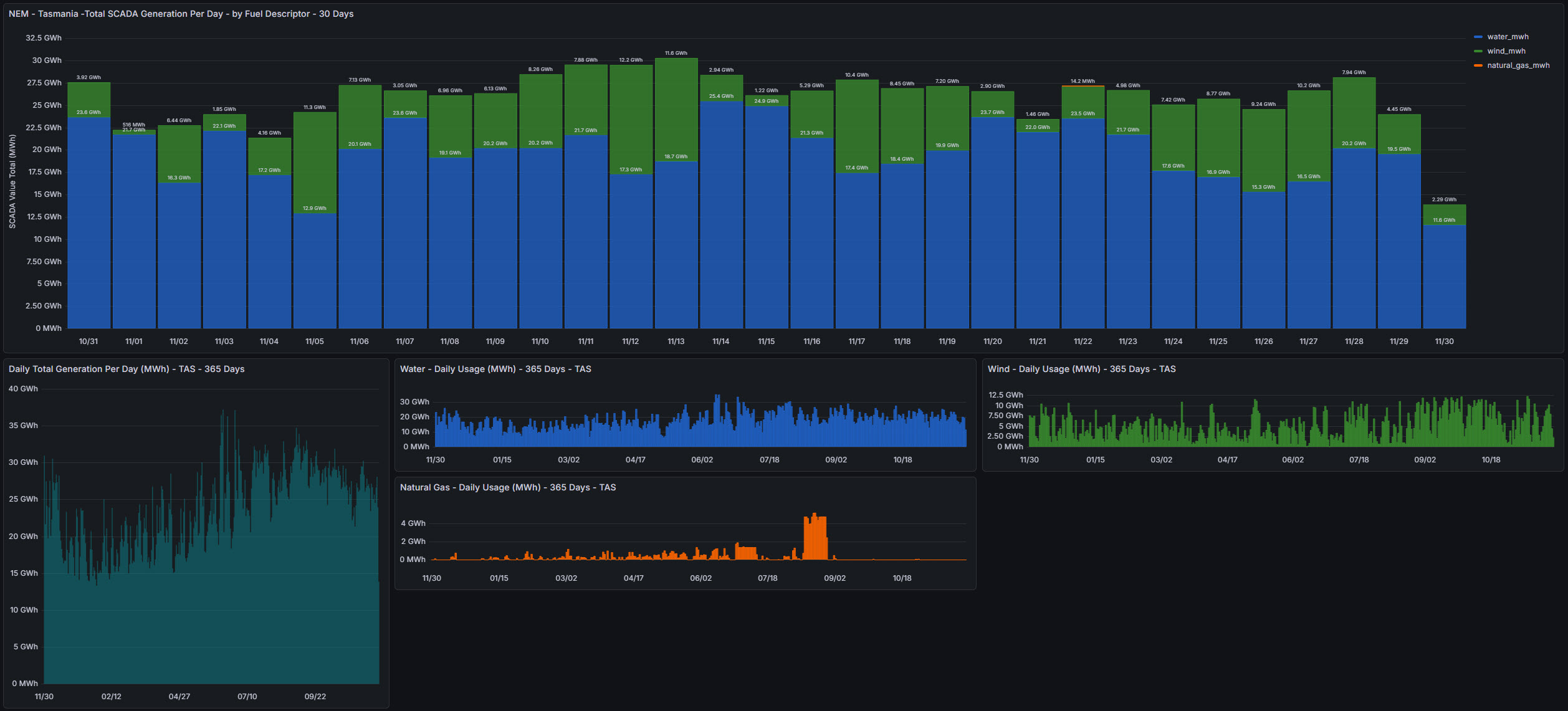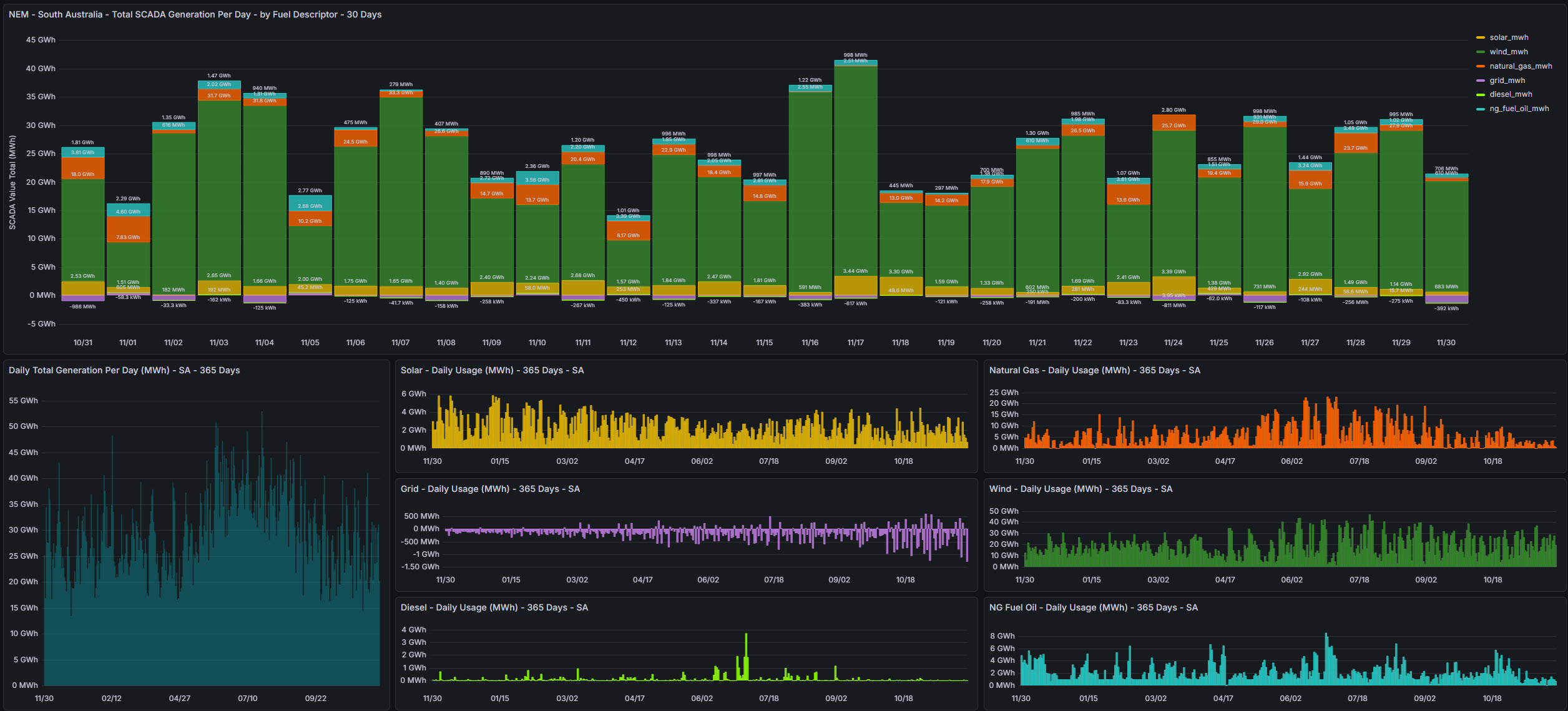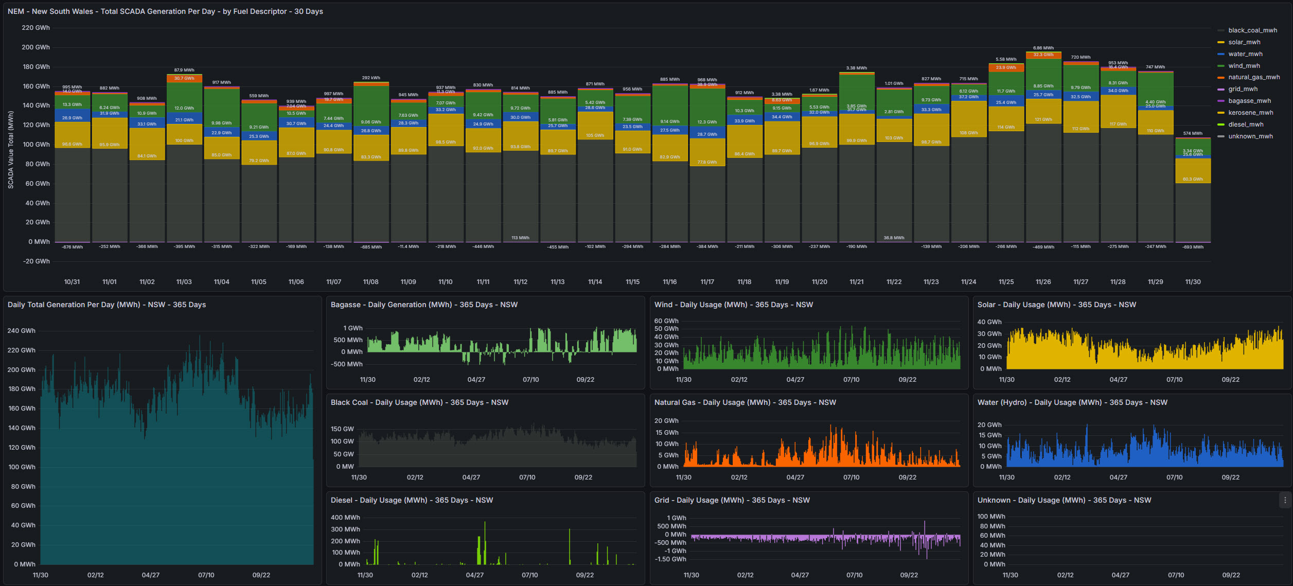 This dashboard primarily aggregates 30 days of Dispatch_SCADA data to show total daily energy (MWh) by fuel descriptor for all NEM regions (NSW,QLD, SA, TAS and VIC). It visualises how different registered assets contribute to the energy mix, using both a stacked daily view alongside per‑fuel time‑series panels for focused longer trend analysis. The aim is a clear story of supply composition and short‑term dynamics.