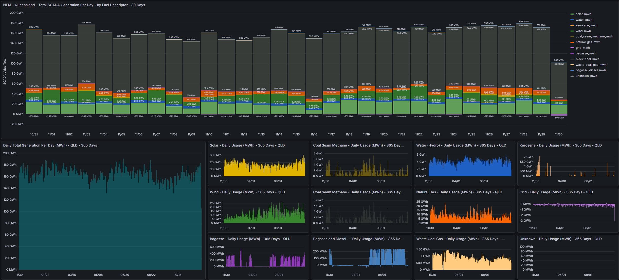 DATE(settlement_date), sums MWh byfuel_descriptor, and orders by days. - Presentation: Stacked daily bars for total mix; per‑fuel time‑series panels for depth; consistent colors per fuel type.