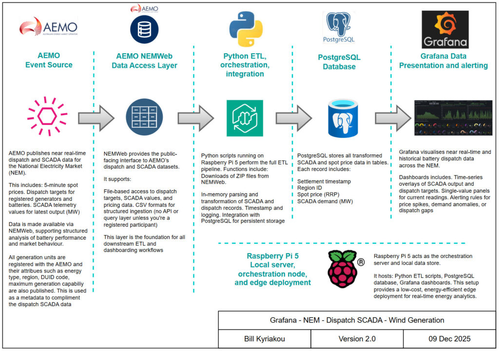 - ETL: Python script (GetStore_Dispatch_SCADA.py) running on Raspberry Pi 5