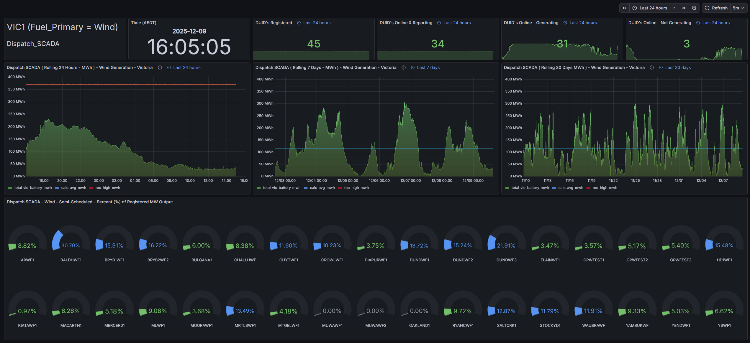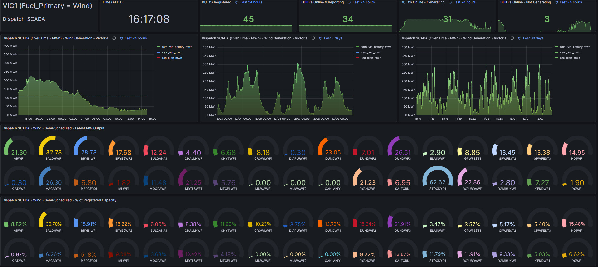 Snapshot gauges and colour‑coded percentages of registered capacity provide instant recognition of which farms are contributing strongly and which are currently under‑utilised. Each panel serves a distinct role, counting for readiness, traces for variability, gauges for farm utilisation performance.