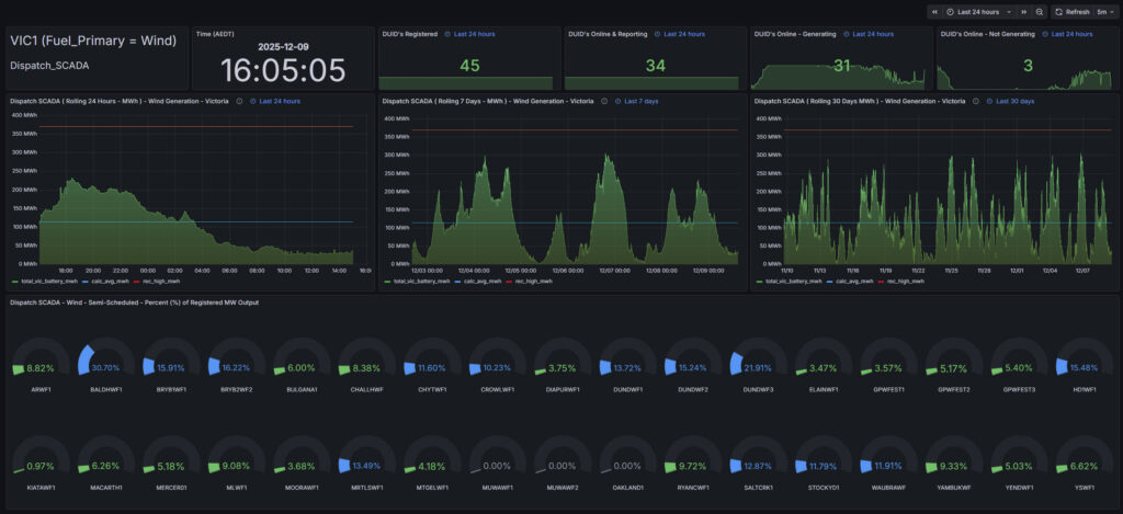 The aim is to move beyond abstract generation figures and tell a more narratable story: Is Victoria’s wind fleet being fully leveraged? Which farms are consistently contributing, and which are falling short? How does the fleet’s behaviour change across different time horizons? By combining gauges, colour codes, and time‑series views, the dashboard makes these questions visible and answerable at a glance.