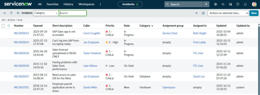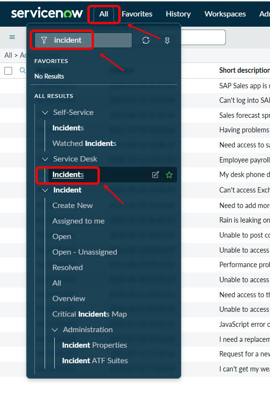 From the ServiceNow home page. Select [All] and search for “incident‘. Then click on Incidents under the Service Desk section.