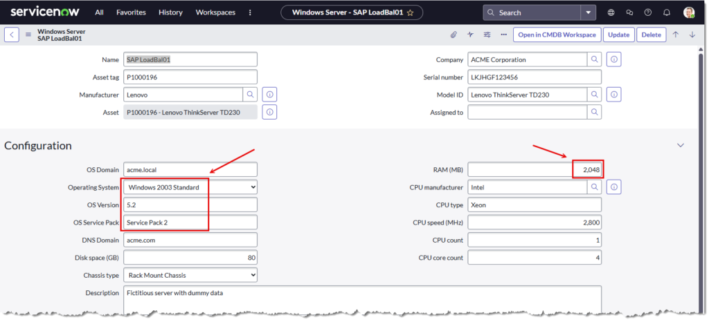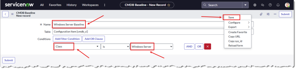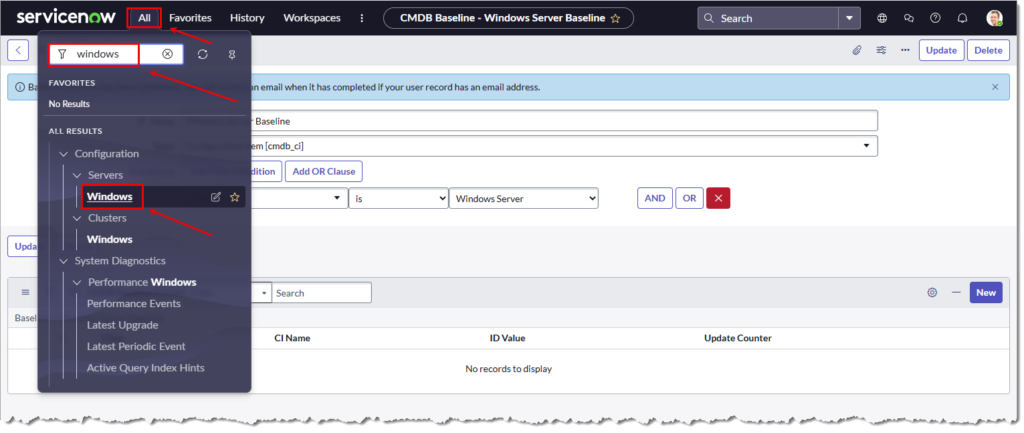 The “CMDB Baseline” Page will refresh with new fields to create a specific baseline report. In this example we want a report on Windows Servers.