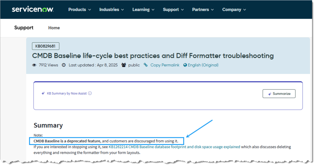 ……and having documented this and researching the subject a little more, it appears ServiceNow have deprecated the Baseline feature. The official ServiceNow source explicitly states CMDB Baselines are… deprecated: